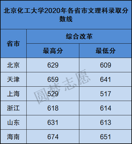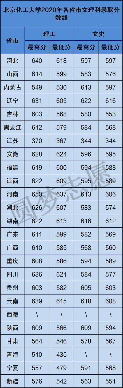 以下为北京化工大学2020年全国各省市最低录取分数线,供参考:
