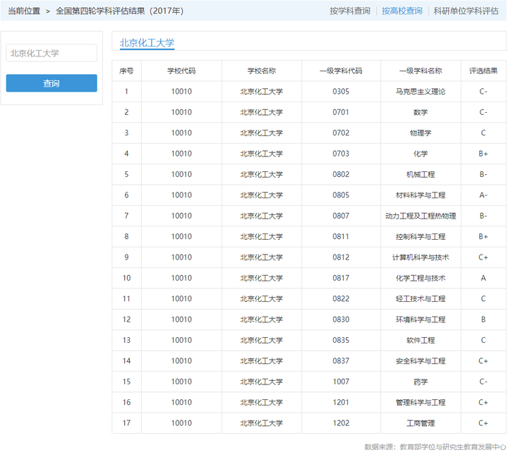 在第四轮国家级学科评价中,北京化工大学共有17个学科,其中材料科学与工程学科评价为a-(5%-10%),化学工程与技术学科评价为a(2%-5%)。化学、控制科学和工程获得B+评价(10%-20%)。