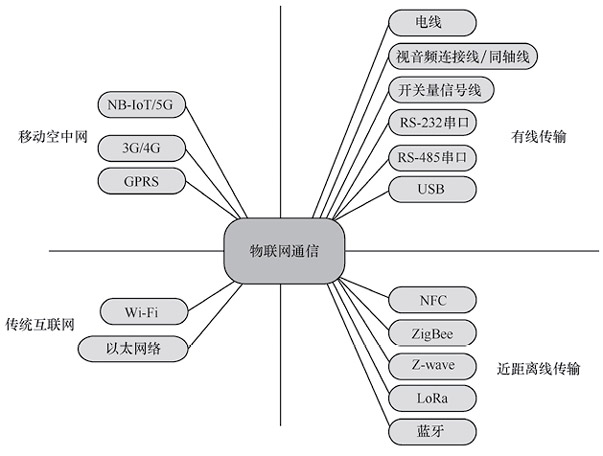 “管”是指通信管道,对应各种有线、无线网络通信技术,负责设备与云平台进行通信。物联网常用的通信方式有蓝牙(Bluetooth)、近场通信(Near FieldCommunication,NFC)、紫蜂(ZigBee)、无线局域网(Wi-Fi)、窄带物联网(Narrow Band Internet of Things,NB-IoT)等,如图所示。